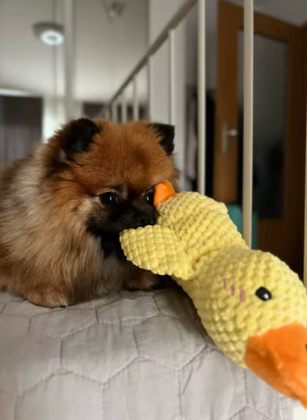 A mi segundo perro le encanta. Lo escondo en un cojín personal y quiere abrazarlo cuando duerme. También juega con él mientras estoy en el trabajo. Es un poco grande, pero como es un perro de tamaño mediano, juega bien con él. Estoy satisfecho, jaja.